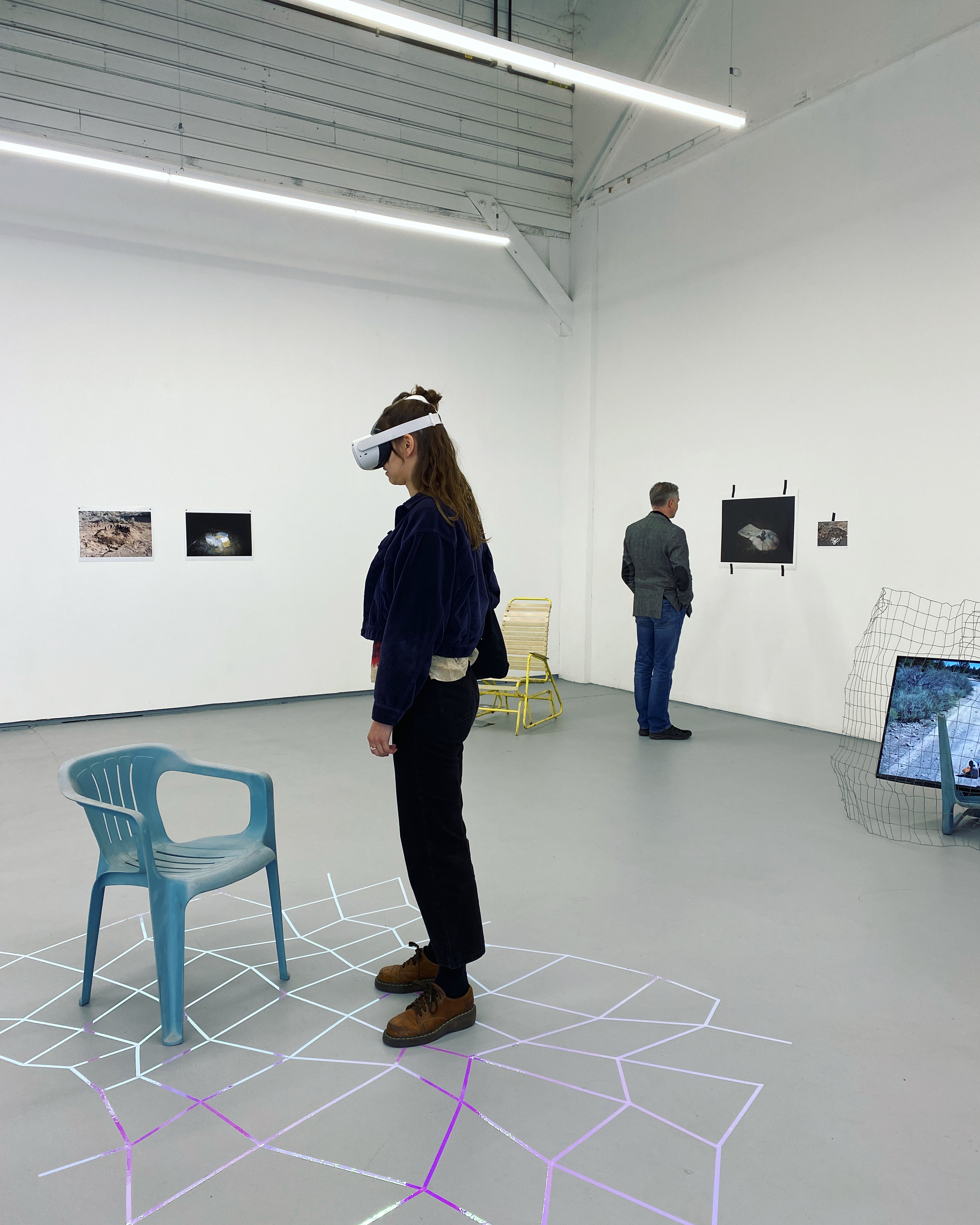 holographic tape, used plastic chair, Meta Quest 2 headset, 360 video